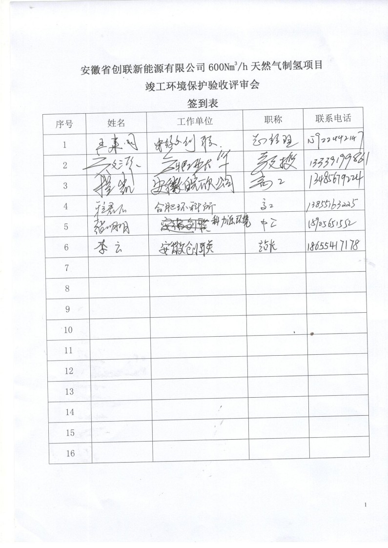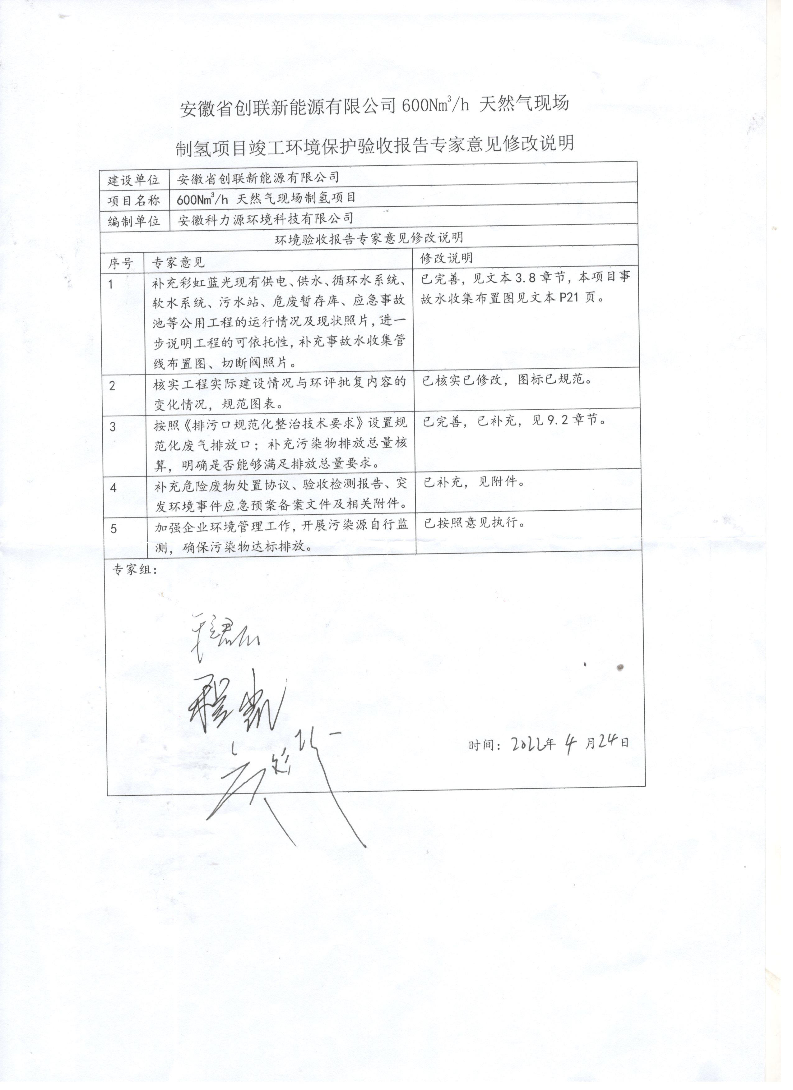 安徽省創(chuàng)聯(lián)新能源有限公司600Nm3/h 天然氣現(xiàn)場制氫項目驗收組嚴格依照國家有關法律法規(guī)、建設項目竣工環(huán)境保護驗收技術規(guī)范、本項目環(huán)評報告書和審批部門審批決定等要求對本項目進行驗收。驗收組認為本項目實施工程按照環(huán)評及其批復的要求,落實了相關環(huán)保設施,建立了相應環(huán)保管理制度,符合環(huán)保驗收條件,可通過環(huán)保驗收。根據(jù)《國務院關于修改<建設項目環(huán)境保護管理條例>的決定》(國務院令第682號),以及環(huán)境保護部《關于發(fā)布<建設項目竣工環(huán)境保護驗收暫行辦法>的公告(國環(huán)規(guī)環(huán)評[2017]4號),現(xiàn)安徽省創(chuàng)聯(lián)新能源有限公司600Nm3/h 天然氣現(xiàn)場制氫項目竣工環(huán)境保護驗收報告公示如下: